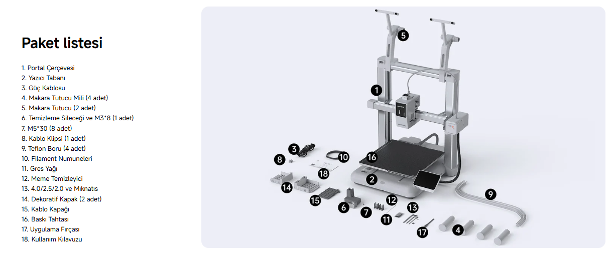 Desteklenen Filamentler: PLA, PETG, TPU, ABS, ASA, PVA ve benzeri filamentler