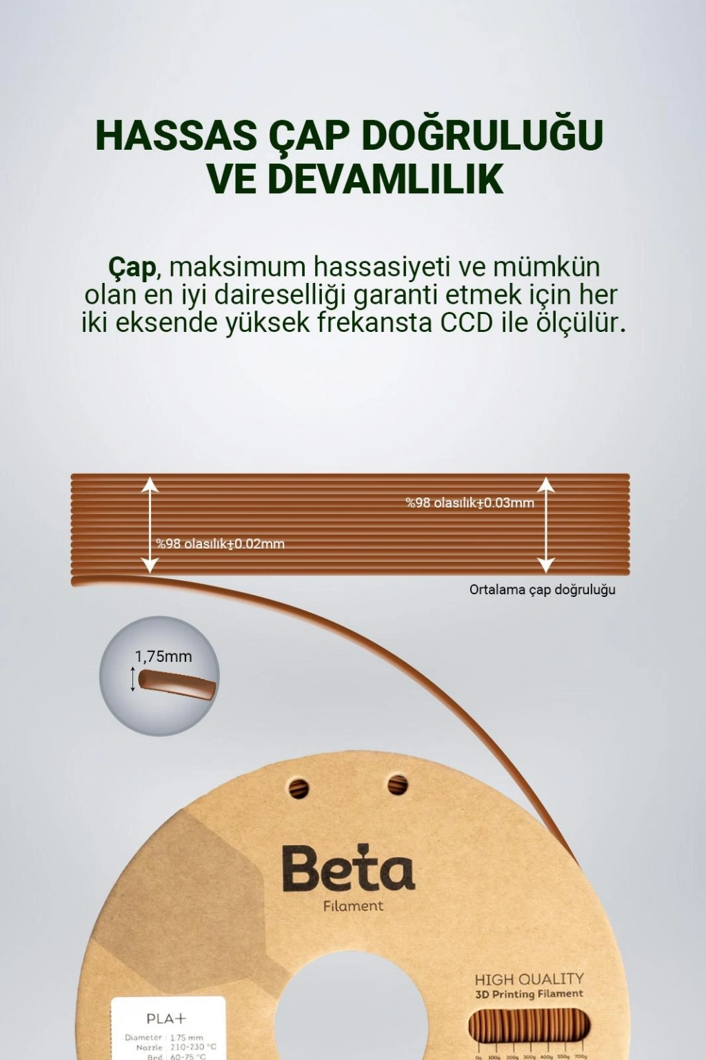 Yüksek Kalite ve Hassasiyet: Beta PLA+ filament, yüksek kaliteli malzemelerin kullanımıyla üretilmiştir. Bu, baskılarınızın ayrıntılarının net ve keskin olmasını sağlar. Filamentin homojen yapısı, baskılarınızın pürüzsüz ve düzgün bir şekilde oluşturulmasını sağlar. Bu özellik, hassas parçalar veya detaylı prototipler oluştururken önemlidir.