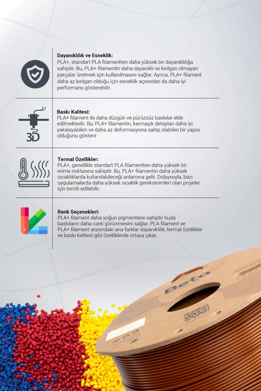 Çeşitlilik ve Canlı Renk Seçenekleri: Beta PLA+  filament, yüksek kaliteli PLA granüllerinden üretilmiştir ve canlı renk seçenekleri sunar. Bu filament, kaliteli malzemesi sayesinde baskılarınızın net ve keskin renklere sahip olmasını sağlar. Ayrıca, geniş renk yelpazesiyle kullanıcılarına zengin bir seçenek sunar. Canlı renkler, baskılarınızı daha çekici hale getirir ve yaratıcılığınızı ifade etmenize olanak tanır. Bu özellikler, Beta PLA+ filamenti 3D baskı projelerinizde tercih etmeniz için güçlü bir neden oluşturur.