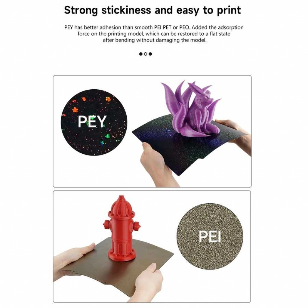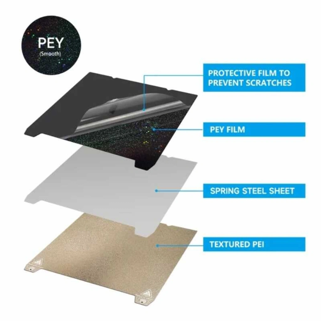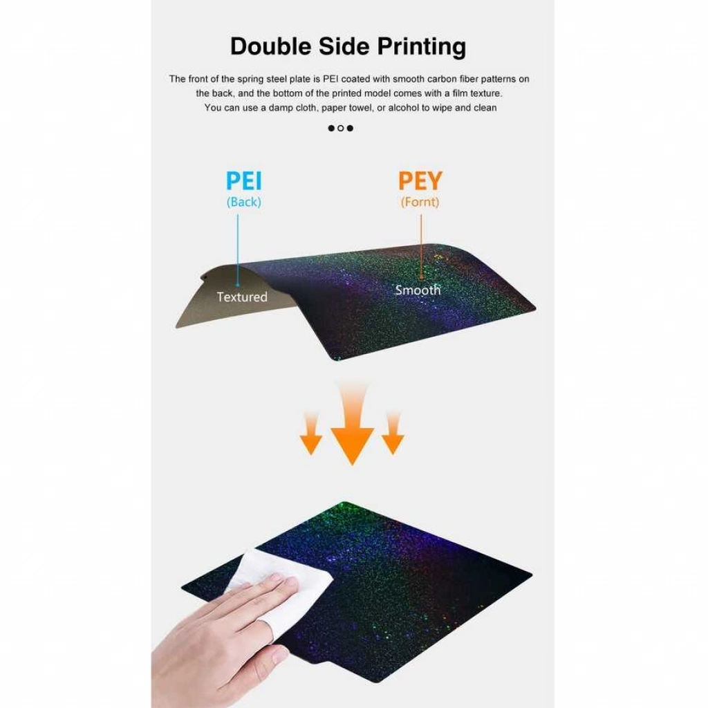 Bir yüzeyi Pei, bir yüzeyi PEY kaplı yay çeliği manyetik tabladır. Baskıların tablaya yapışma kabiliyetini çok büyük oranda arttıracaktır. Creality K1 Max başta olmak üzere, CR-10 Smart, CR10 Smart Pro, Ender 3 S1 PLUS, Ender 3 Max vb. boyutlardaki 3d yazıcılarla uyumludur.