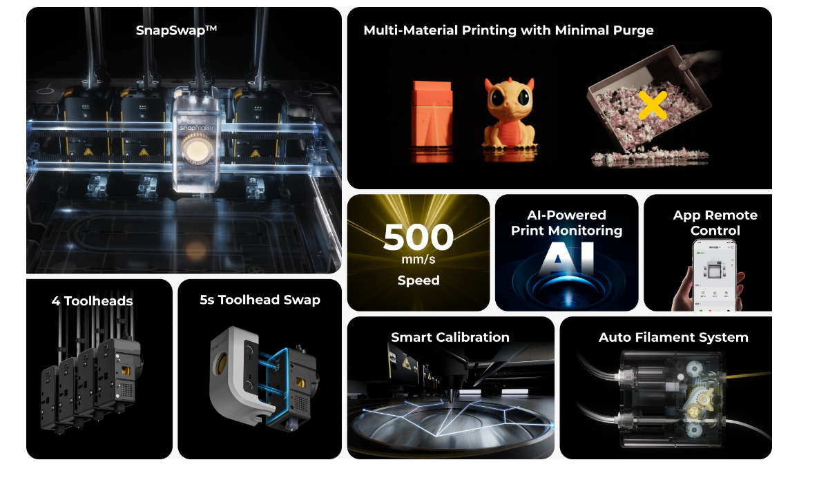 Snapmaker U1, SnapSwap™ hızlı araç kafası değişim sistemi ile takım kafalarını yalnızca saniyeler içinde değiştirebilir. Bu, filament geçişlerinde zaman kaybını engeller ve üretim hattındaki duraklamaları azaltır. Renkli ve fonksiyonel baskılarda malzeme geçişleri hızlı ve güvenlidir.